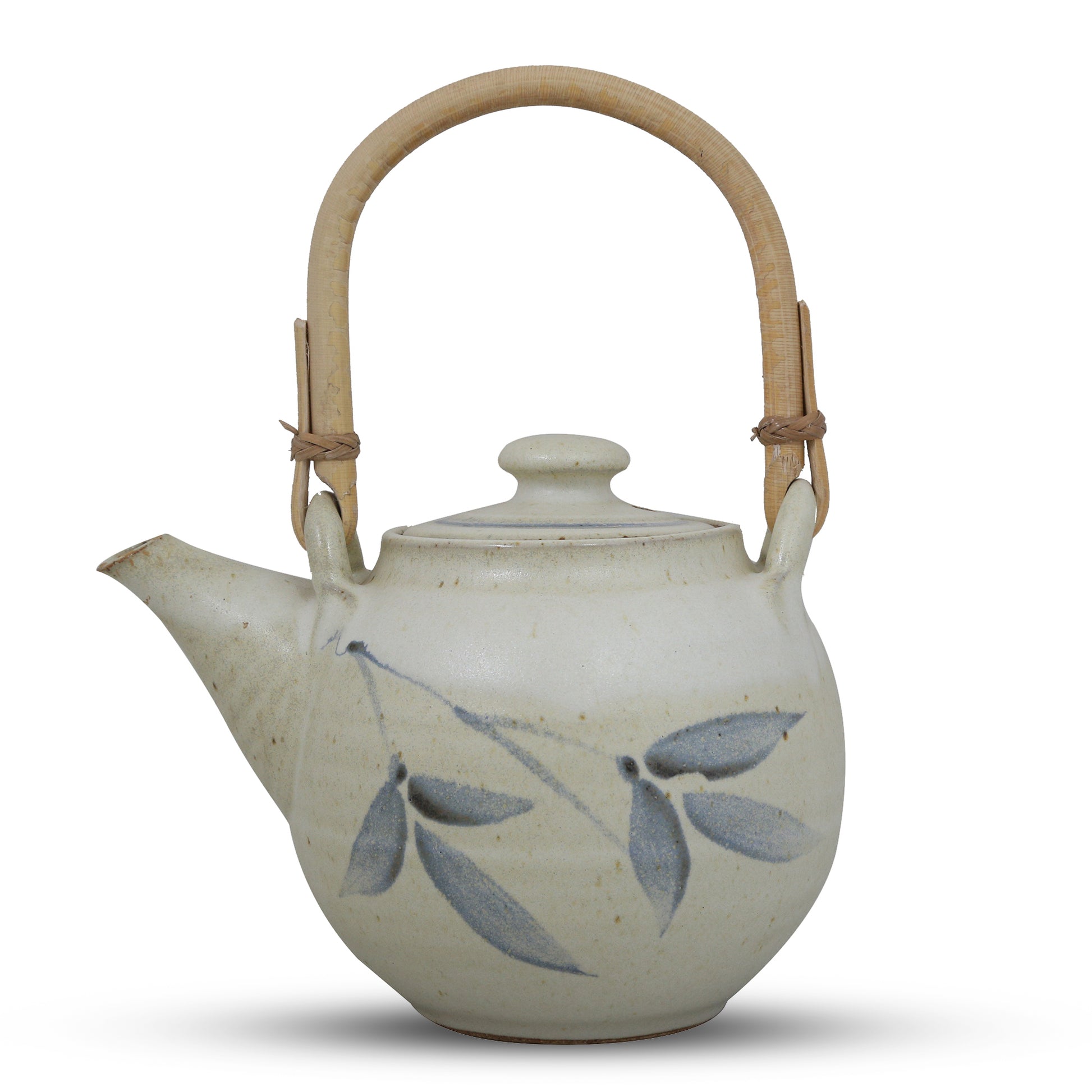 Studio Pottery Teapot with Cane Handle (White & Blue)